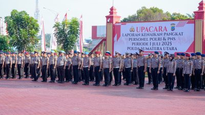 MEDAN – Kapolda Sumatera Utara, Irjen Pol. Whisnu Hermawan Februanto, S.I.K., M.H., memimpin langsung upacara kenaikan pangkat Perwira, Bintara, Tamtama periode 1 Juli 2025 serta PNS Polri periode 1 Februari, 1 April, dan 1 Juni 2025 di Lapangan KS Tubun Mapolda Sumut, Rabu (2/7/2025).