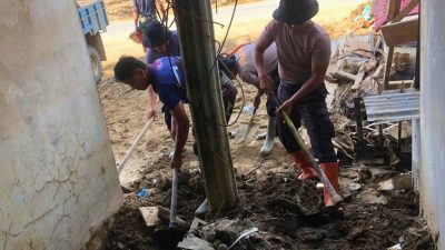 Selain itu, personel Brimob bersama unsur TNI bahu-membahu melakukan pembersihan sisa lumpur, material, dan puing bangunan di rumah warga. Pembersihan dilakukan di bagian samping rumah milik Bapak Kornel Simbolon dan dilanjutkan pada rumah Bapak Halomoan Manalu.