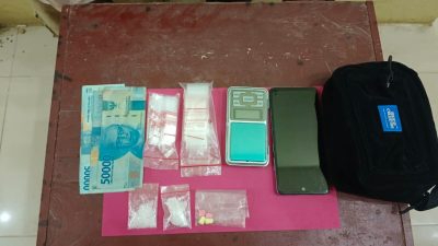 Serta mengamankan barang bukti yang ada padanya berupa 1 buah Tas samping., 1 Buah alat timbangan., 2 buah plastik klip berisikan narkoti jenis sabu dengan berat beruto 7,02 gr., uang tunai Rp.200.000, 2 bal plastik klip kosong., 4 butir pil ekstasi, dan 1 unit handphone android merek oppo.