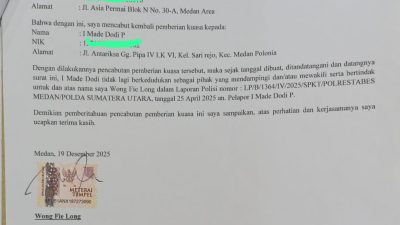 Medan | TIRAM NEWS, Wong Felung resmi mencabut kuasa pengurusan laporan polisi dalam kasus sengketa sewa scaffolding yang menyeret dua perusahaan, menandai babak baru penanganan perkara yang kini sepenuhnya diambil alih oleh kuasa hukum keluarga. Langkah tegas ini memperlihatkan adanya ketegangan serius dalam proses pendampingan sebelumnya dan sinyal bahwa jalur hukum akan dikawal lebih ketat.